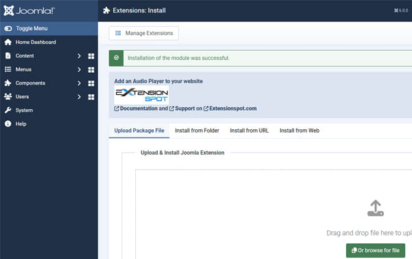 mod_es_audio_player-vjx.v.xx.zipfile you downloaded onto the upload area. - Once you see the "Installation of the module was successful" message, you are ready to start.