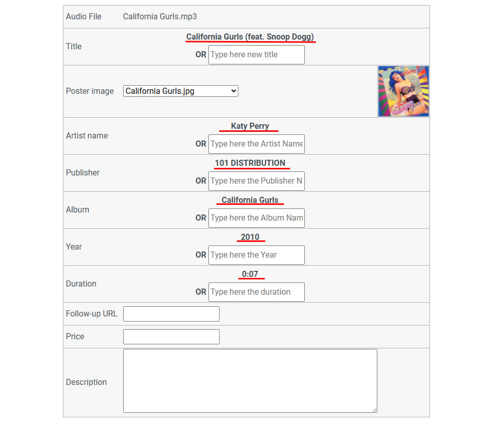 Follow-up URL / Price: If you want to sell your music, you can enter a "Buy Now" URL in the 'Follow-up URL' field and a 'Price'. These will display if enabled in the module's main options.