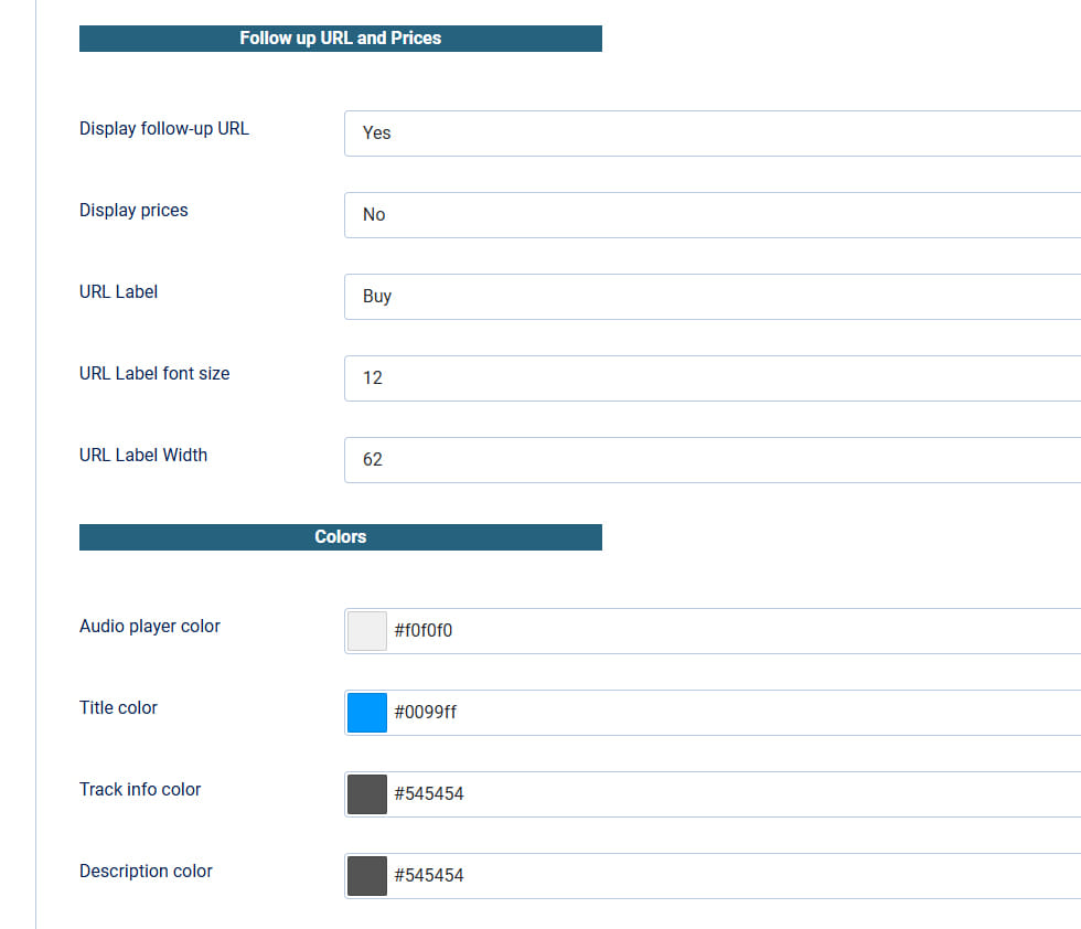 Player & Style Options: Here you can set the Audio player width and customize all the Colors (Title color, Artist color, Background color) to perfectly match your website's template.