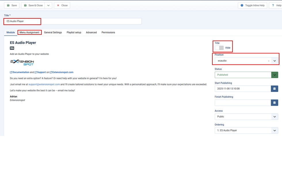 Go to the Menu Assignment tab and choose which pages the module should appear on (e.g., "On all pages" or just your "Blog" page).