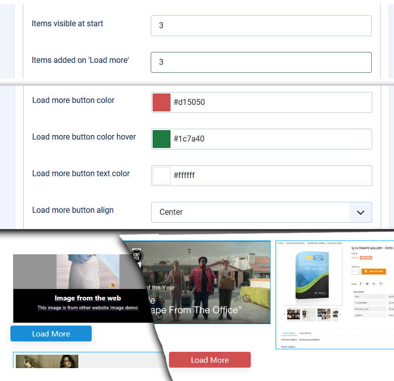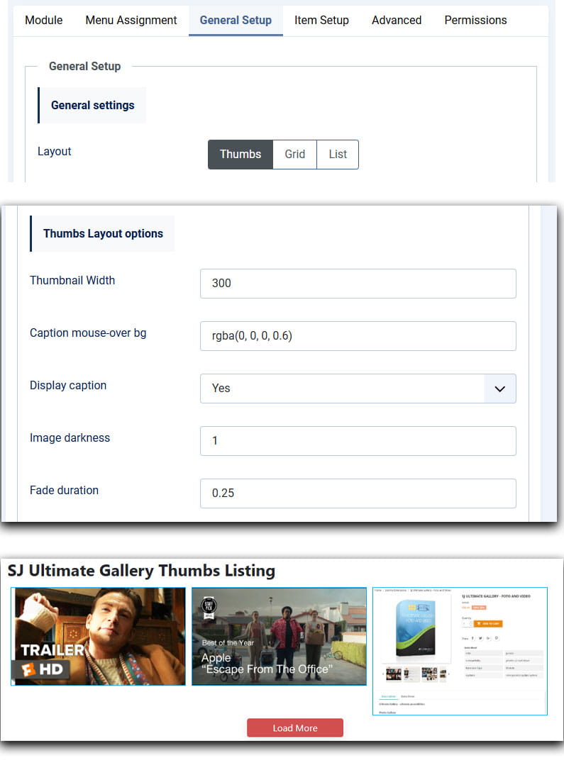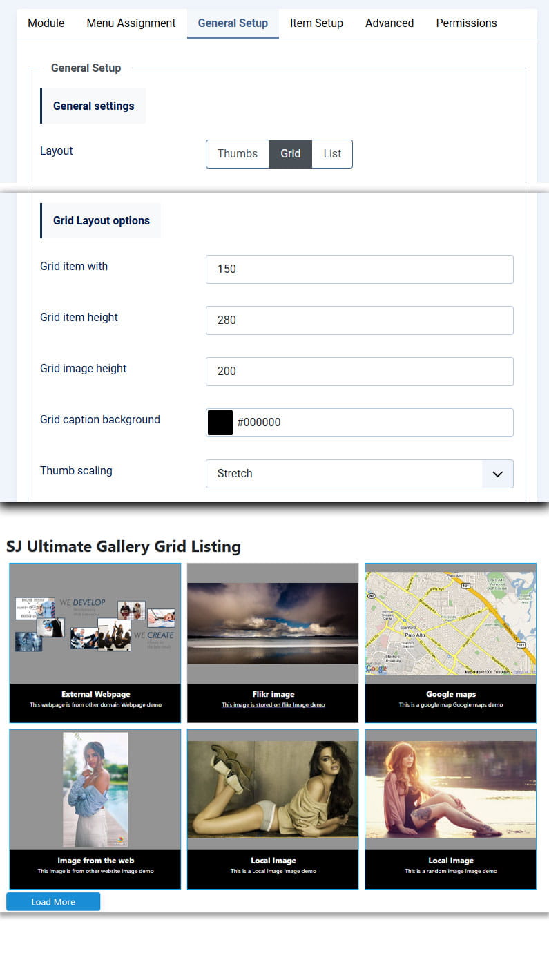 - Options: Grid item with and height, Grid image height, Grid caption background color, Thumb scaling