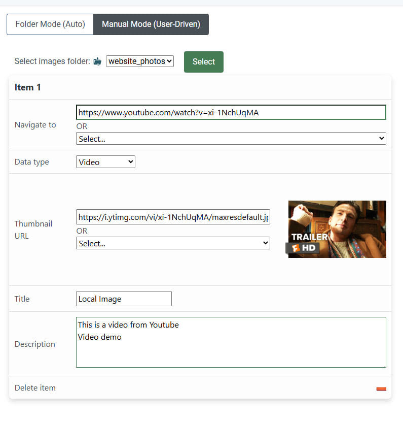 Manual Mode gives full control — add each gallery item with its own image, thumbnail, title, description and optional video URL.