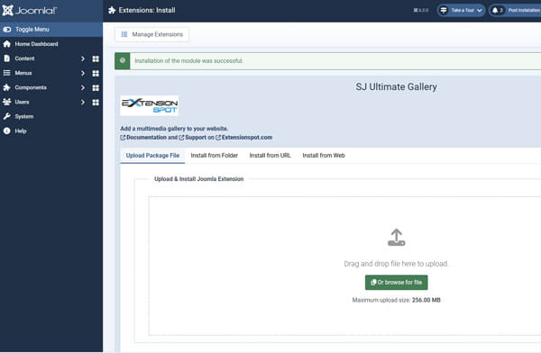 mod_sj_ultimate_gallery-JX.v.X.zipfile you downloaded onto the upload area. - Once you see the "Installation of the module was successful" message, you are ready to start.