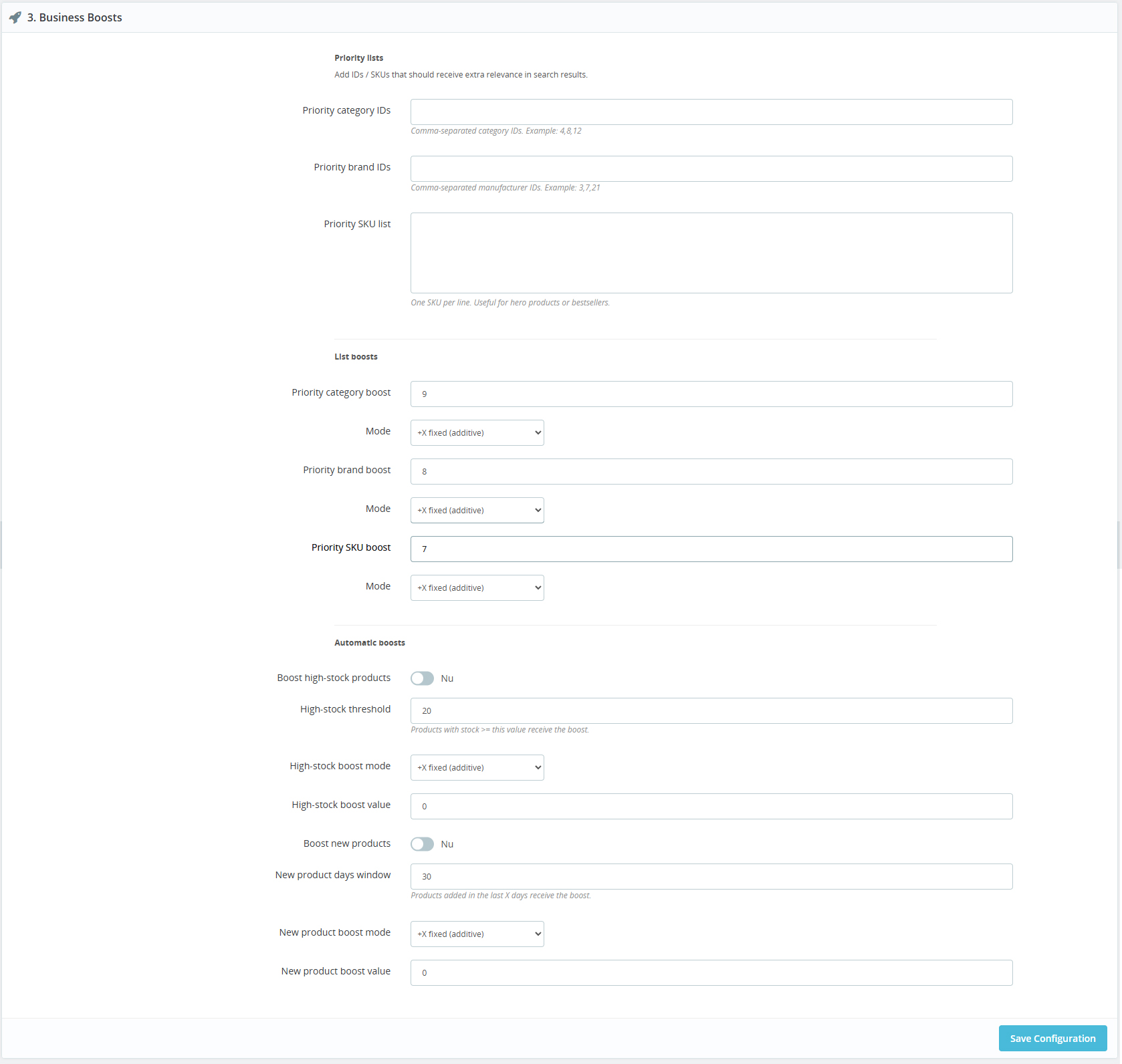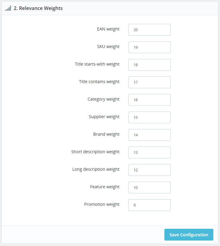 Fine-tune product ranking with configurable weights across key product fields.